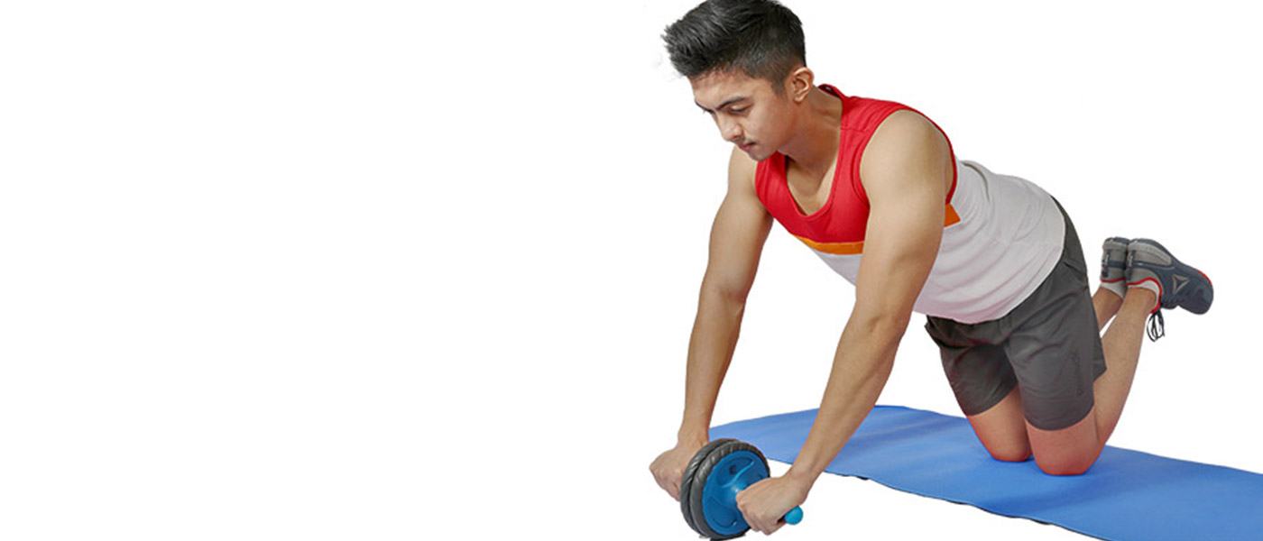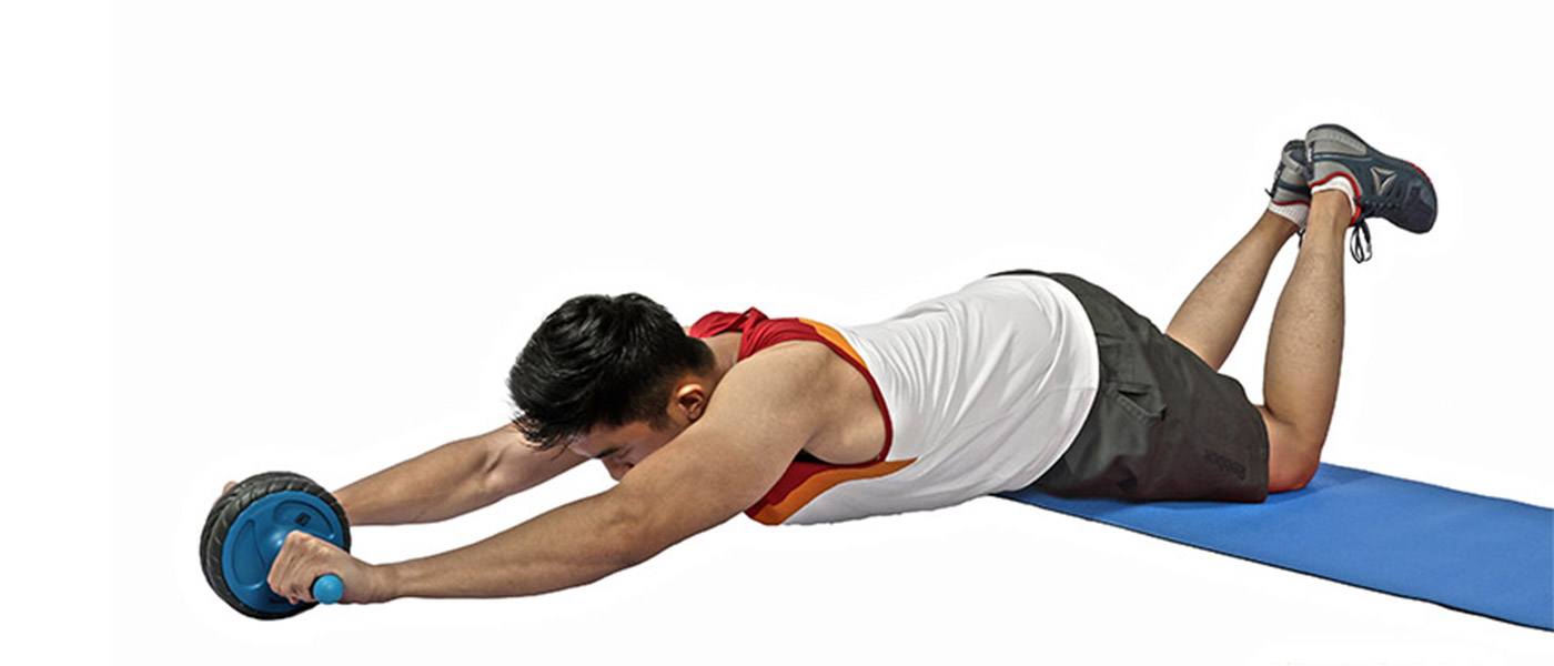 Kencangkan otot perut dan batang tubuh, putar bahu ke belakang, lalu gulirkan AB Roller ke depan serendah semampu Anda. Pastikan punggung tetap rata dan pinggul tidak jatuh. Tahan sebentar, kembali ke posisi awal.
