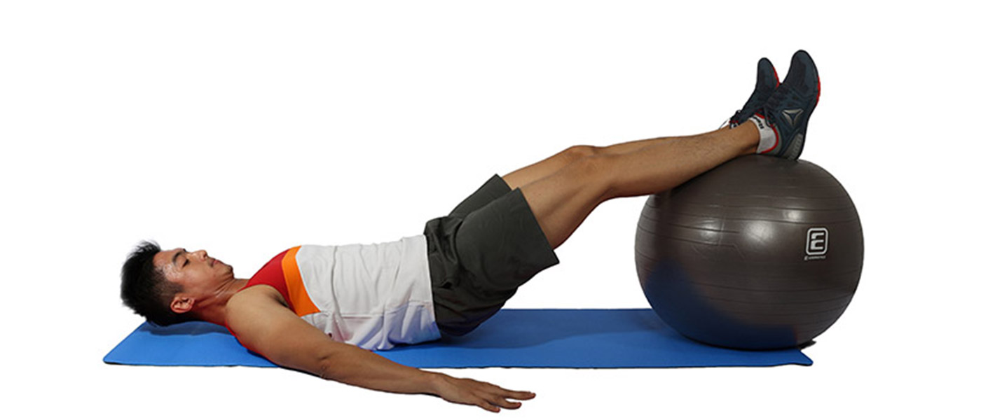 Berbaring teletang di atas matras. Letakkan tumit dan betis di atas bola. Tempatkan kedua tangan di samping tubuh sebagai support dan untuk menyeimbangkan tubuh.