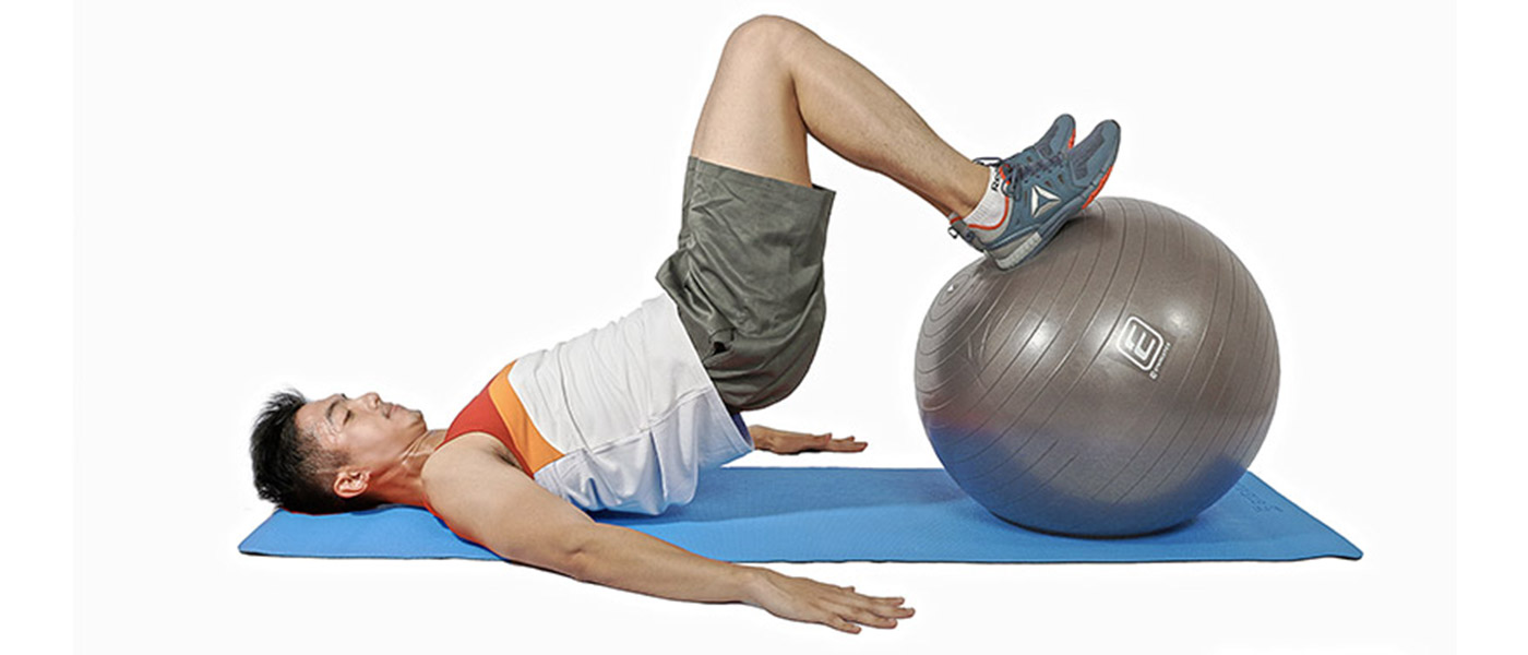 Angkat pinggul dari matras hingga tubuh membentuk garis lurus, lalu gulirkan bola mendekati bokong dengan cara menekuk lutut. Pastikan punggung rata dan tulang belakang netral (neutral spine). Tahan sebentar, kembali ke posisi awal.