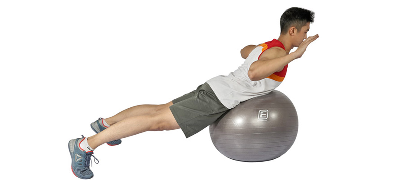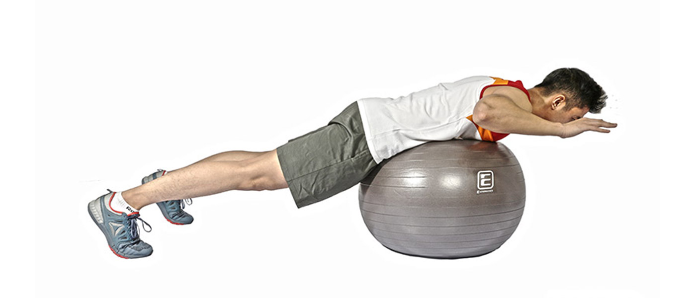 Berbaring telungkup pada bola. Buka kaki selebar bahu dan luruskan tubuh dari leher hingga tumit. Tekuk siku dan buka kedua tangan di samping bahu.